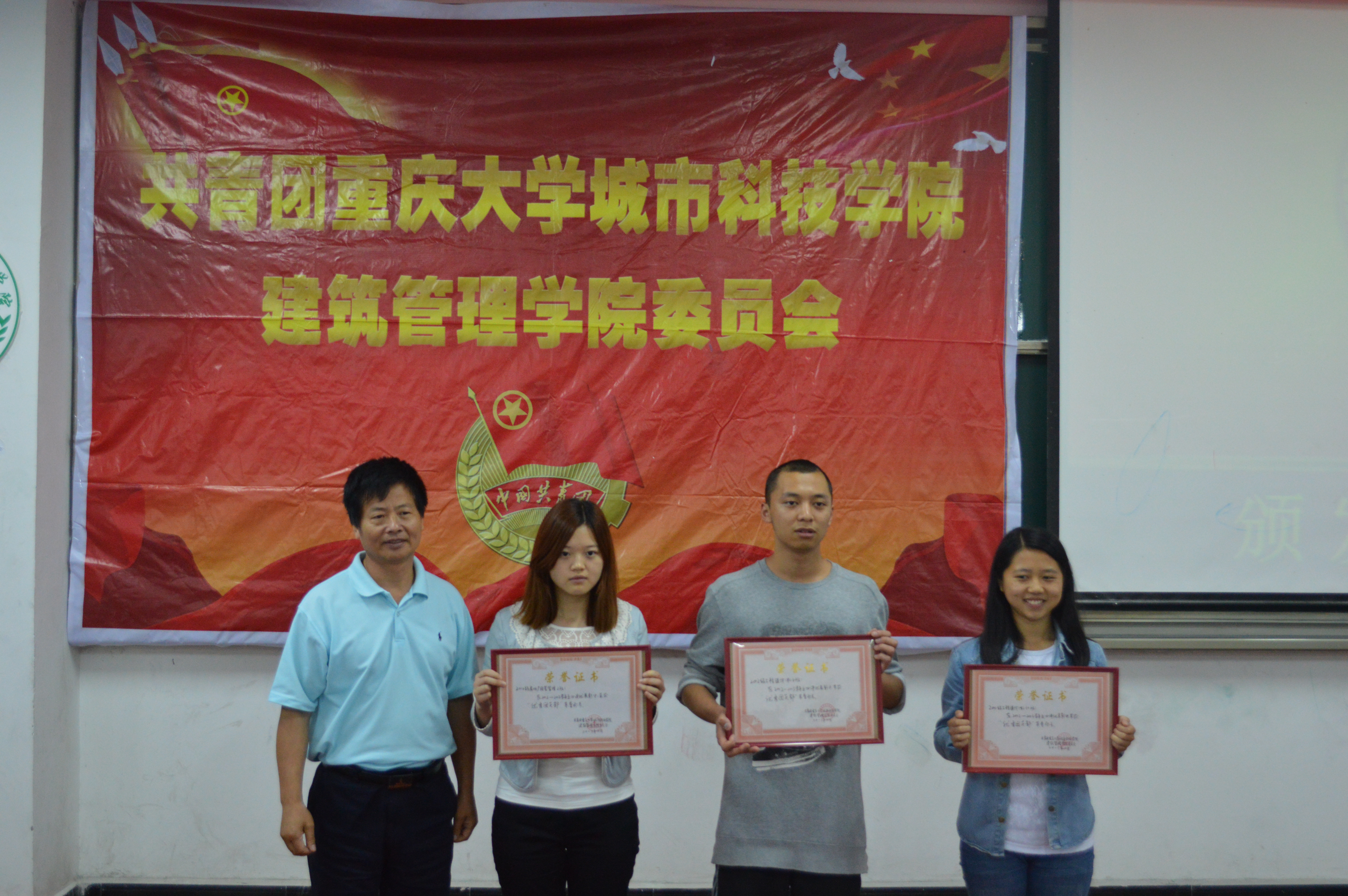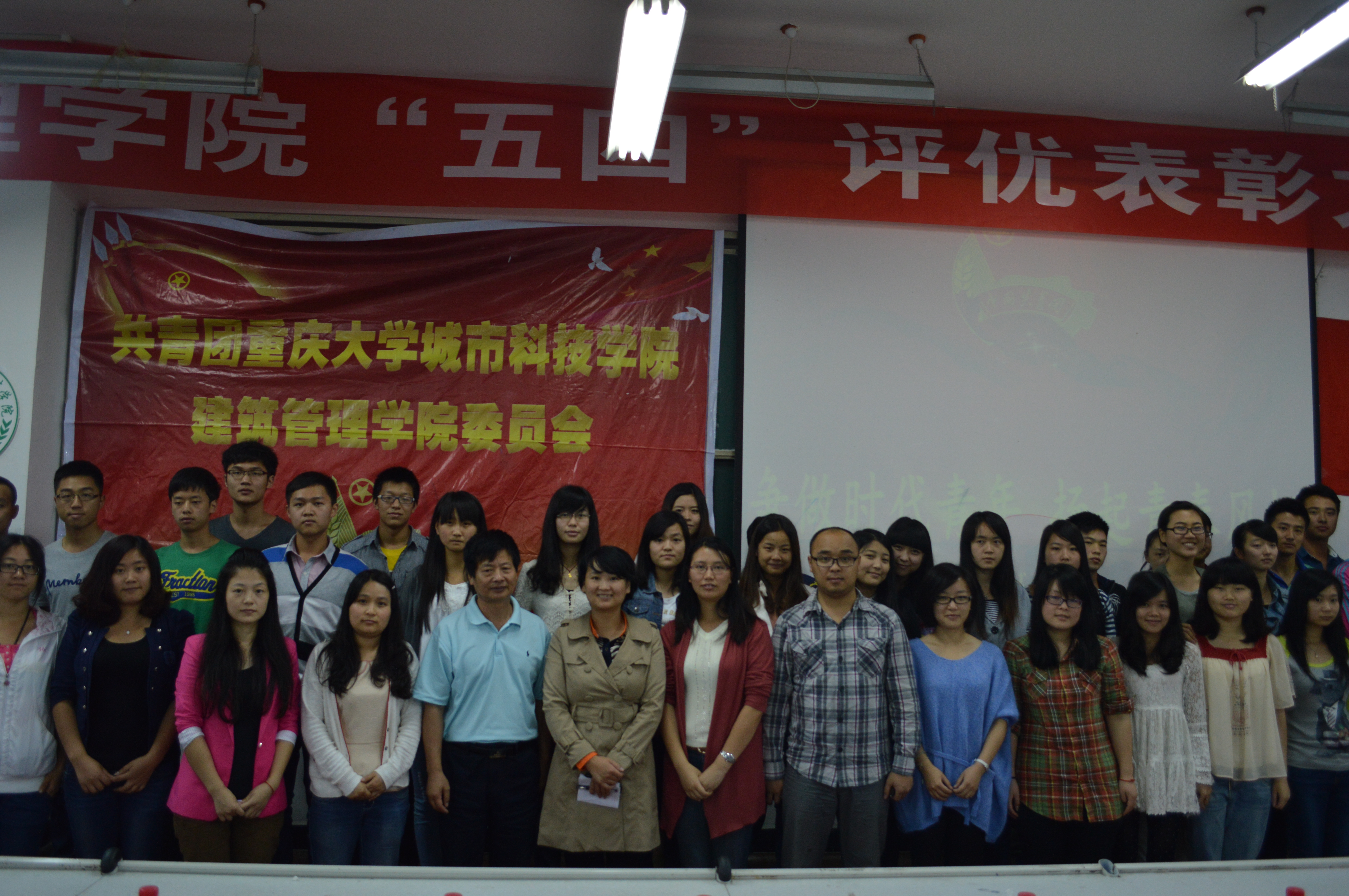 2013年5月9日中午12点40分,重庆大学城市科技学院建筑管理学院在主教113隆重召开了2012-2013学年“五四”评优表彰大会。建筑管理学院党总支书记诸海磊、党总支副书记杨丽清、团总支书记谭莉、第一学生党支部书记陈海萍、第三学生党支部书记肖和平、第四学生党支部书记牟珊出席本次大会。
