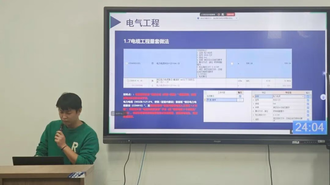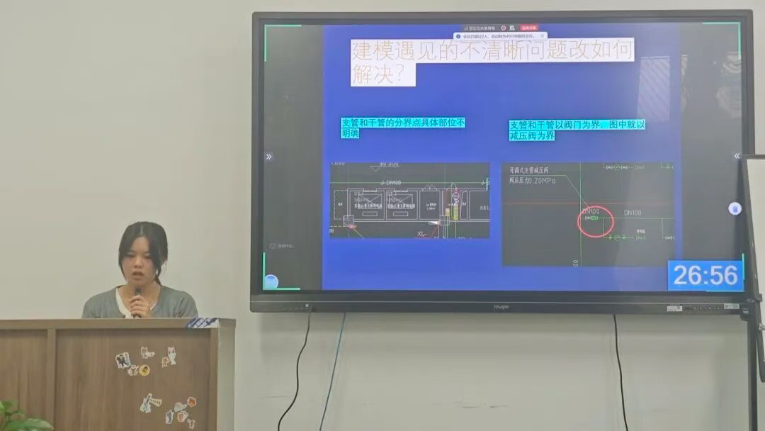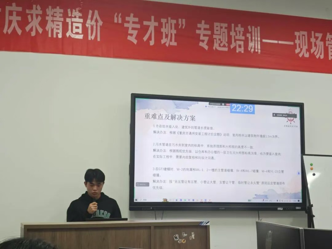 以匠心筑就梦想,用技能开创未来。2025年10月22日,实验楼204室内思想激荡、精彩纷呈——求精造价专才班阶段性成果汇报在此隆重举行,并同步面向线上学员直播互动,生动呈现了“线上+线下”混合式教学与考评的创新模式。活动现场,由李春娥、杨稀童两位专任指导老师全程线下指导及点评,企业导师会后线上检查学生成果,16名学子精神抖擞,分成4个小组轮番上阵。他们不仅是专业技能的娴熟运用者,更是数字化时代的创新实践者。从BIM模型的精准构建,到GCCP组价的周密测算,学员们将先进工具与工程实践深度融合,交出了一份份令人满意的答卷。他们围绕管线布局的智慧优化与项目成本的精益管理展开深入探索,所展现的前沿视野与解决问题的能力,为安装工程数字化管理体系的构建注入了蓬勃的青春动能。