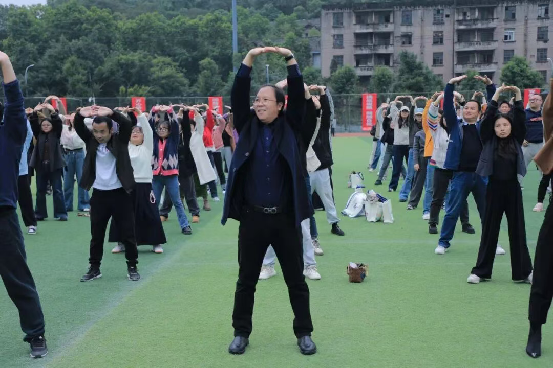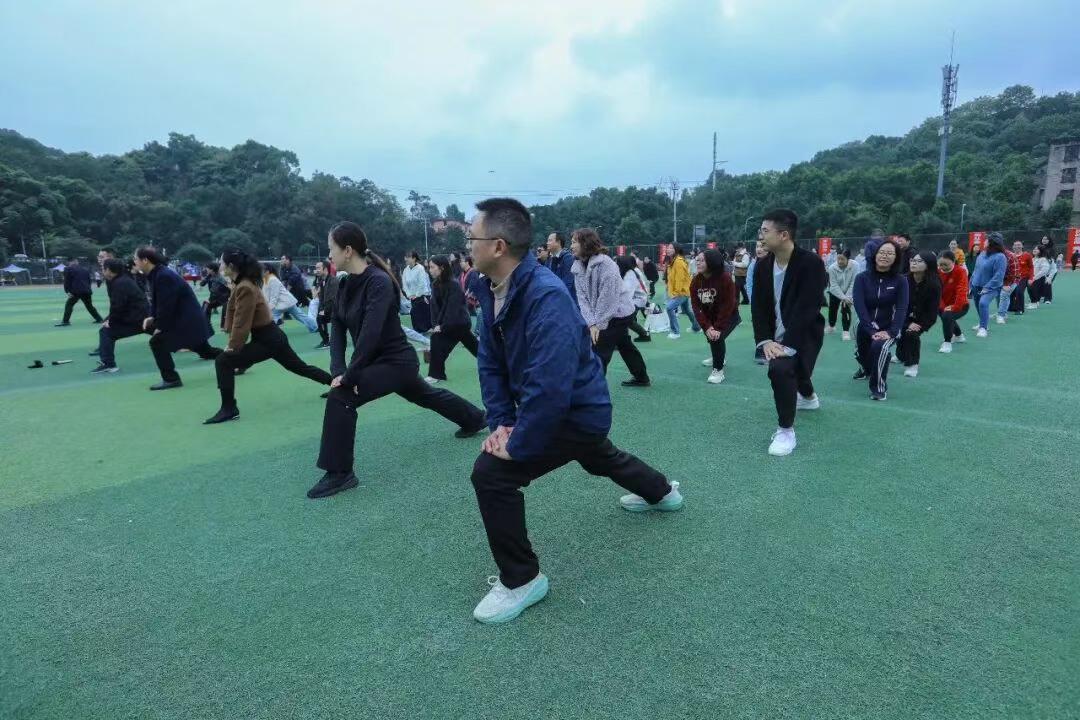 接下来就到大家期待的"动起来"环节啦!第一个环节“内外兼修”特邀全国健将级运动员——体育与大健康学院的邹蓉老师,带着大家一起解锁传统养生秘籍"八段锦"!看那起势动作柔中带刚,一招一式圆活连贯,配合着均匀深长的呼吸,简直是身心的双重SPA~老师们瞬间从"工作模式"切换到"放松频道",跟着节奏伸伸胳膊踢踢腿,在一呼一吸间把压力统统甩掉!这场传统养生与趣味活动的碰撞,不仅让现场充满了文化气息,更让大家彻底放松下来,为后面的精彩环节热好了身、开足了劲儿!