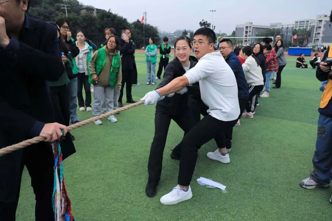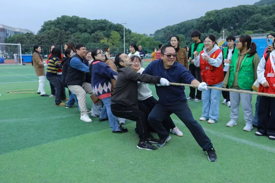“加油!加油!”随着震天响的呐喊声,咱们的“力拔山兮”拔河大战火热开场啦!这一拉可不得了,现场气氛直接燃到爆!建筑管理学院的活动志愿者们温馨的给老师们早早备好了拔河手套,全程忙前忙后维持秩序!各学院的老师们瞬间化身“大力士”,双手死死攥住绳子,脚像钉在地上一样蹬得稳稳的,身体齐刷刷往后倒,劲儿往一处使!最后经济管理学院的学工老师们一路过关斩将,把冠军奖杯稳稳抱回家!这拔河赛简直就是大家的“热血青春秀”,太飒啦!