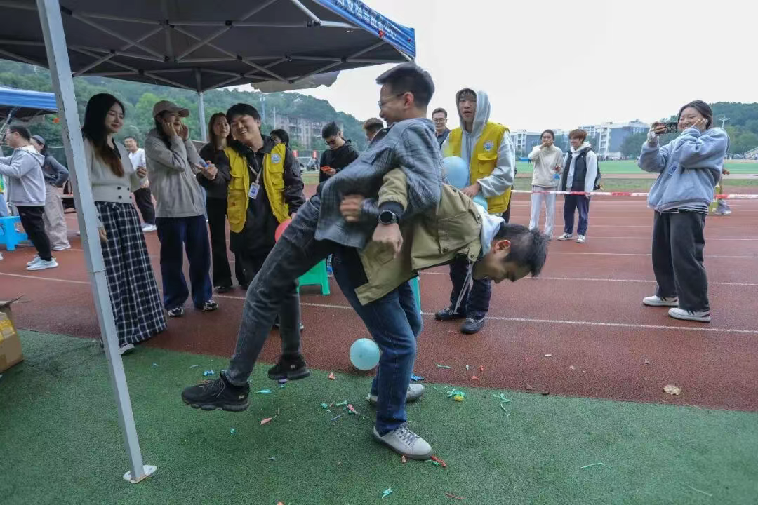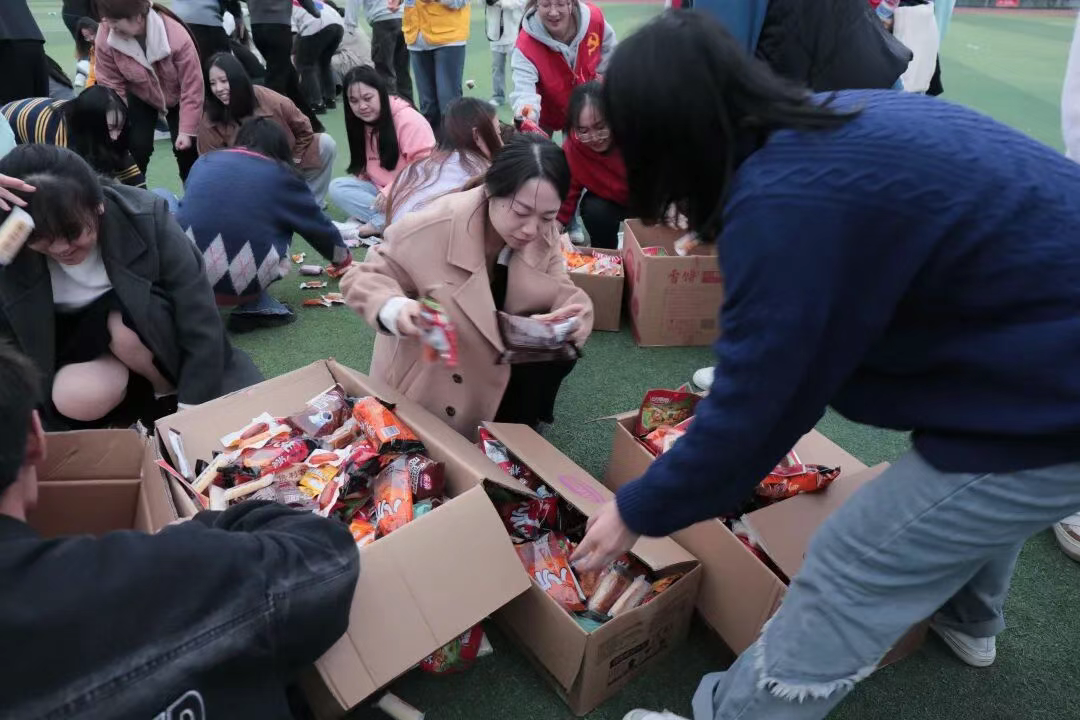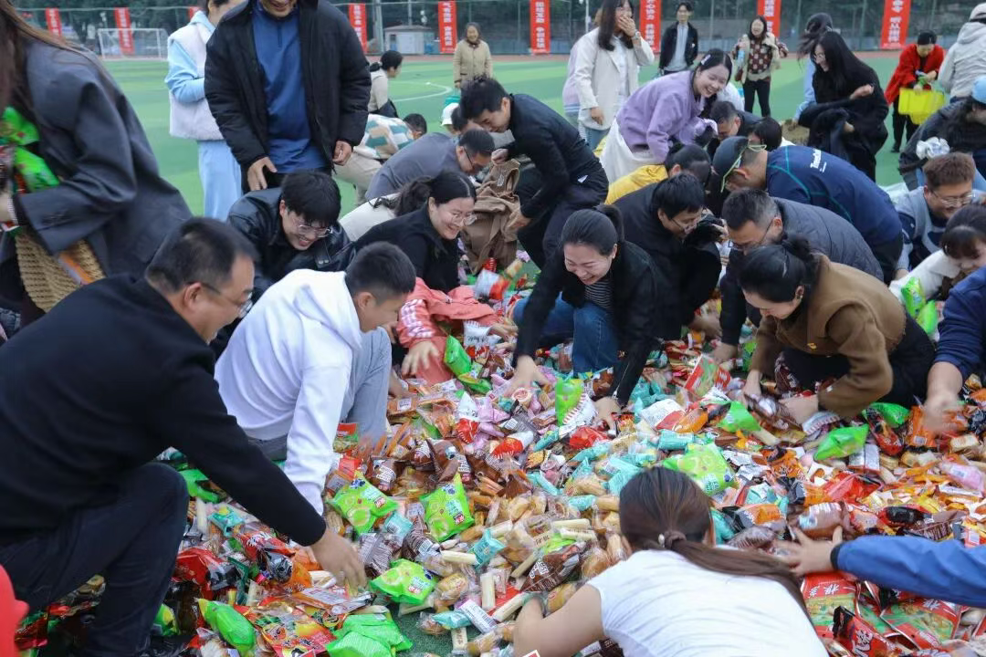紧随其后的“零食大作战”环节更是欢声笑语连连。以各二级学院的书记为起点,围成一个圆圈,老师们则依次排成一条长线,在主持人一声号令之下,中心圆圈中的“零食小山”瞬间消失,让原本紧张激烈的赛场氛围,被轻松愉悦的互动所取代。在欢声笑语中,老师们不仅增进了彼此的交流,还拉近了距离,充分展现出“人心齐,泰山移”的团队协作精神!