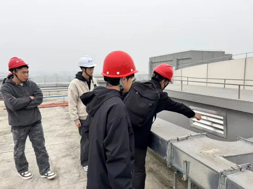 屋顶区域的专项研讨聚焦管线综合布设、设备安装定位及荷载分析等高阶内容。师生围绕通风系统排布逻辑、管线交叉避让方案、结构安全与成本平衡等议题,与工程师进行深度对话。通过亲手测量、走向推演与适配分析,学生们不仅掌握了复杂场景下的多专业协同设计方法,也为参加国际高校BIM毕业设计创新大赛积累了具有实践指导意义的建模经验。