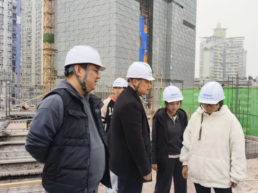 学院师生抵达项目后,受到了重庆鹏威建筑工程有限公司项目领导班子的热情接待。双方随后举行校企实践交流会,公司技术负责人详细介绍了“重庆龙湖江屿海棠”项目的基本情况、管理模式与创新工艺,并重点展示了智慧工地的建设成果。