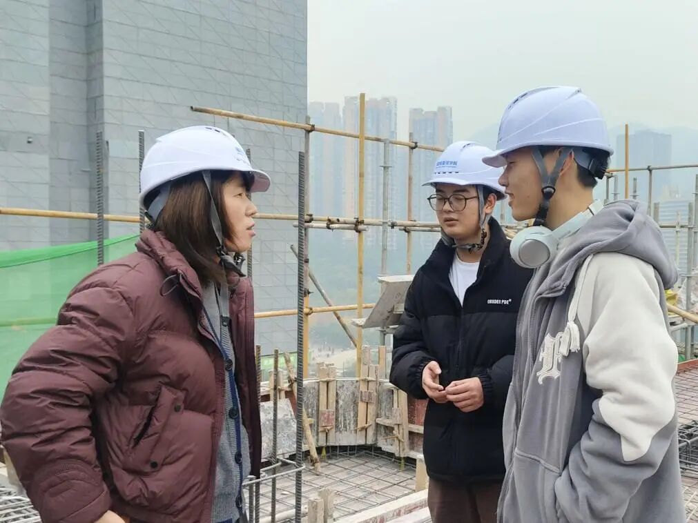 随后,项目安全负责人为同学们开展了入场安全教育培训。在工程项目负责人的带领下,师生有序进入施工区域进行实地观摩。项目负责人结合施工现场实际情况,系统讲解了钢筋混凝土结构从基础垫层、模板安装、钢筋绑扎到混凝土浇筑与养护的全流程关键工艺。通过实地展示ALC条形板、混凝土泵送管、烧结页岩多孔砖、竖向桥架,让同学们直观理解结构施工的技术要点与质量控制标准。师生还参观了本项目设置的施工工艺样板展示区,对标准化施工流程有了更清晰的认识。整个参观环节中,带队指导教师与项目技术负责人围绕新型施工工艺、工程材料应用及现场管理方法等议题展开了广泛而深入的交流,实现了理论与实务的双向互动。