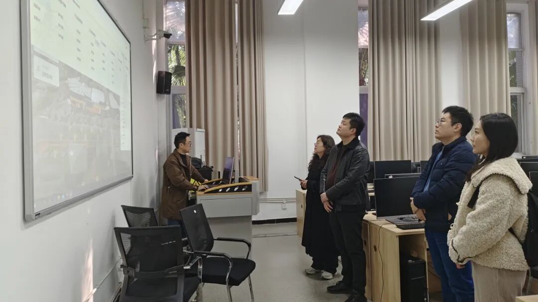 座谈结束后,双方共同前往建筑管理学院实验楼进行实地参观。杨稀童老师现场操作并展示了基于真实建筑项目构建的“智慧运维管理平台”。该平台依托物联网与三维可视化技术,接入了真实建筑的实时运行数据,涵盖能耗监控、设备运维、环境感知等多个维度。程凯老师从教学应用角度进行系统讲解,指出该平台不仅用于辅助理论教学,更支持学生开展数据分析、系统仿真与运维决策等实践环节,真正实现了“教学做合一”。