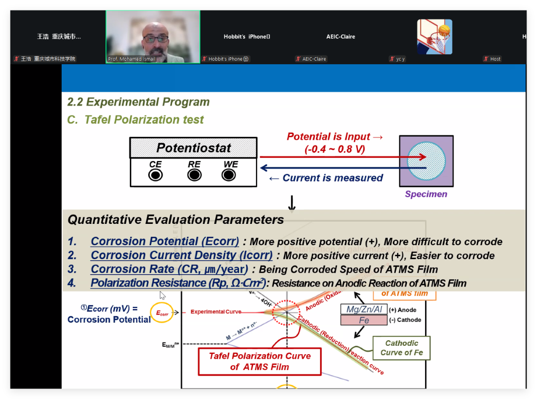 在专题交流中,英国布鲁内尔大学 Mohamed A. Ismail 教授聚焦钢结构腐蚀带来的耐久性与高维护成本问题,介绍 ATMS 防腐薄膜在水工钢结构中的应用及验证方法。通过 Tafel 极化与 EIS 阻抗谱测试,综合 Ecorr、Icorr、CR、Rp 及等效电路参数对薄膜体系进行定量评价。研究发现,Zn–Sn 优于纯 Zn,Al–Mg 通过形成致密氧化膜抑制 H₂O/Cl⁻ 渗入而优于纯 Al,为长寿命防护方案选择提供依据。