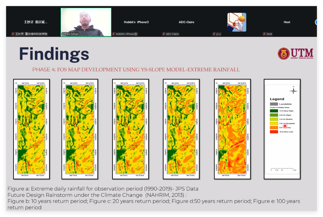 马来西亚理工大学 Ahmad Safuan Bin A. Rashid 教授以《综合岩土评估:连接气候变化预测与边坡稳定力学》为题,选取槟城岛构建“气候情景—致灾因子—易发性分区—稳定性验证”框架:用 SDSM 生成未来气候,结合地形与人类活动因子;以 SVM 建立滑坡灾害图并用 ROC-AUC 验证;再引入 YS-Slope 在极端降雨下制备 FoS 图,对不同重现期暴雨下稳定性分级变化进行对比。结果表明,气候变暖增雨将推动危险区迁移,低 FoS 区域随暴雨增强而扩大,为风险分区管控与防灾决策提供支撑。