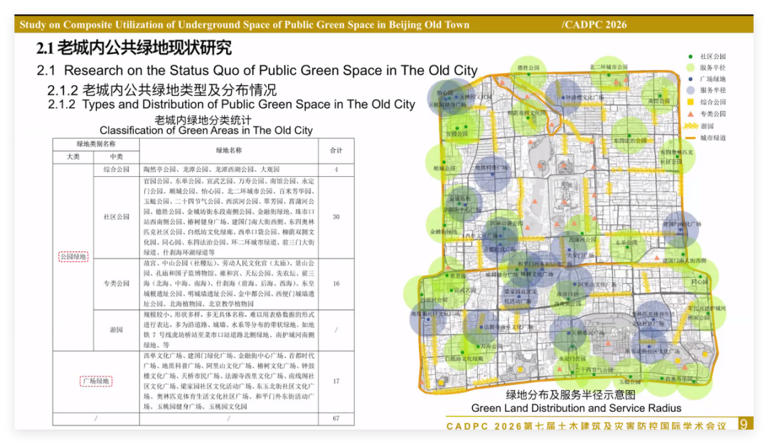 北京工业大学胡斌副教授以《北京老城区公共绿地地下空间复合利用研究》为题,针对老城土地紧约束与公共服务供给不足,提出以公共绿地地下空间为载体推动集约化、复合化开发。报告梳理绿地类型结构、空间分布与服务半径,指出现状偏重地表生态功能、综合效益不足;结合国内外案例,总结“下沉组织—多层联通—采光绿化导入”等策略;提出“绿地+社区便民”模式,在公园与广场地下配置便民商业与生活服务设施,形成分层布局与设施整合,提升可达性与综合效益,为老城更新提供可复制路径。