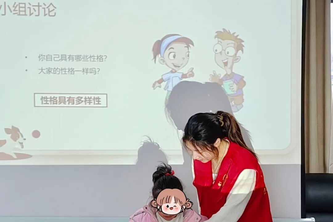 在轻松的氛围中,通过趣味思考提问引出“性格”概念,充分激发孩子们的探索兴趣。志愿者们围坐在孩子身边,辅助福华社工讲解性格的内涵与特点,用通俗易懂的语言拆解知识。结合生动案例举例不同性格特质时,志愿者及时引导身边的小朋友积极思考,让大家明白每一种性格都有独属于自己的价值。最后的小组讨论环节,志愿者全程陪伴引导,鼓励孩子们大胆分享、倾听交流,真切感受到性格的多样性,让每个孩子都懂得:自己是独一无二、闪闪发光的存在。